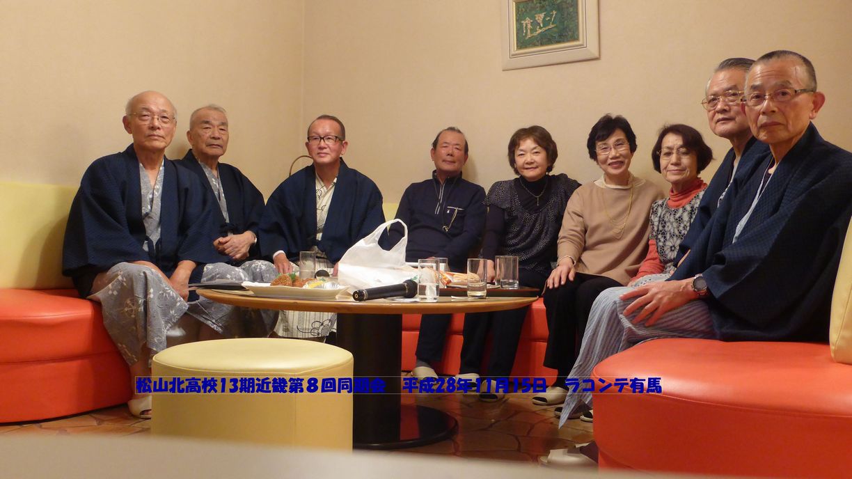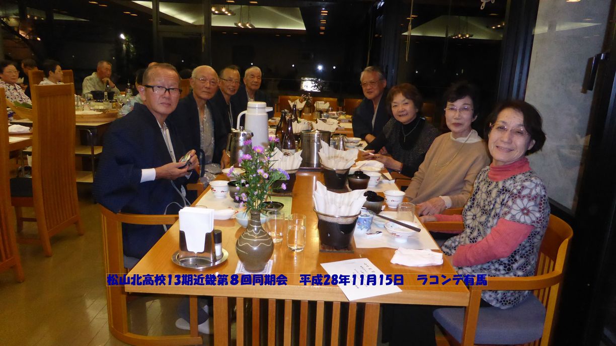 平成28年11月15日〜16日に第8回となる13期近畿支部同期会を有馬温泉"ラコンテ有馬"(ダイハツ健康保険組合保養所)で行いました。 紅葉の季節なので、少し早く集合し秀吉が紅葉を楽しんだという瑞宝寺公園などを散策しました。 金泉の露天風呂、銀泉の内湯で疲れを癒した後、宴会です。夕食をいただきながらみんなの近況報告や思い出話など和やかな時間を過ごしました。その後、カラオケルームに移動し、懐かしのメロディから最近の歌までのど自慢の人もそうでない人も大いに盛り上がりました。 翌日は、ロープウェーで六甲山頂に行き、紅葉を楽しみながら散策し、六甲山ホテルで昼食をいただき、さらに西の方に行って最後は三宮で来年の再開を約して散会しました。 | |